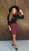 MERLOT PLEATED FAUX LEATHER SKIRT